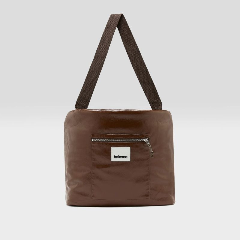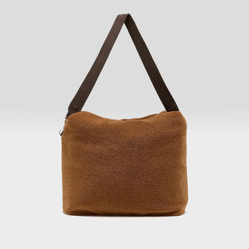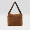 Bolso de hombro reversible marrón, con un lado en piel sintética revestida y el otro en peluche marrón. Cuenta con asas de cuerda y una correa de hombro extraíble.