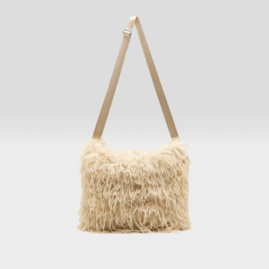 Bolso de hombro reversible con asas de cuerda y correa de hombro extraíble en contraste. Un lado de piel sintética con efecto pluma y el otro de ripstop gris.