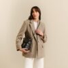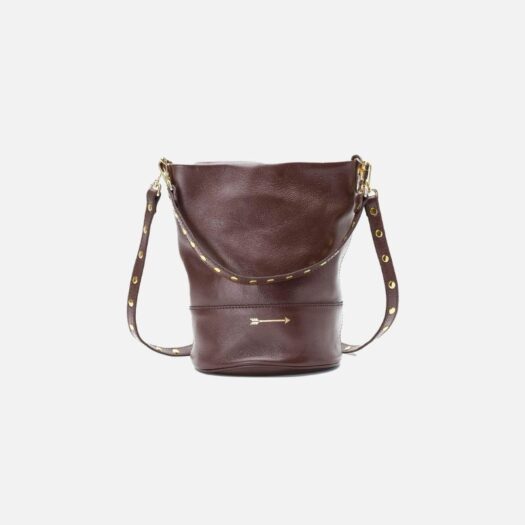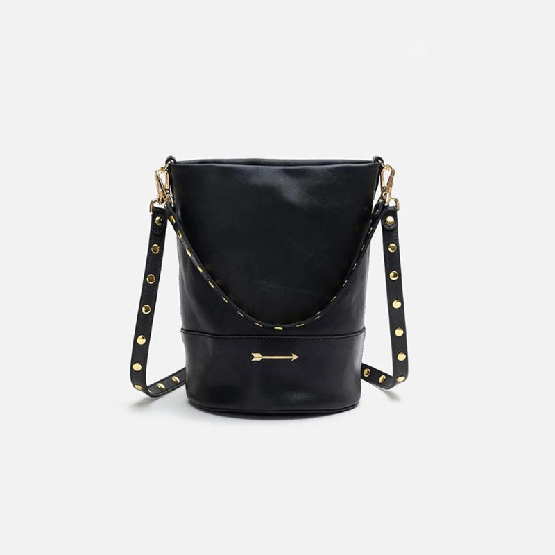 Bolso mediano de piel estilo cubo que cuenta con dos asas de remaches desmontables: corta para poder llevarlo en el hombro o en la mano y una larga para llevarlo estilo bandolera o colgado.