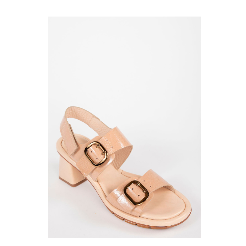Sandalia de charol con cierre de hebillas.