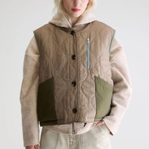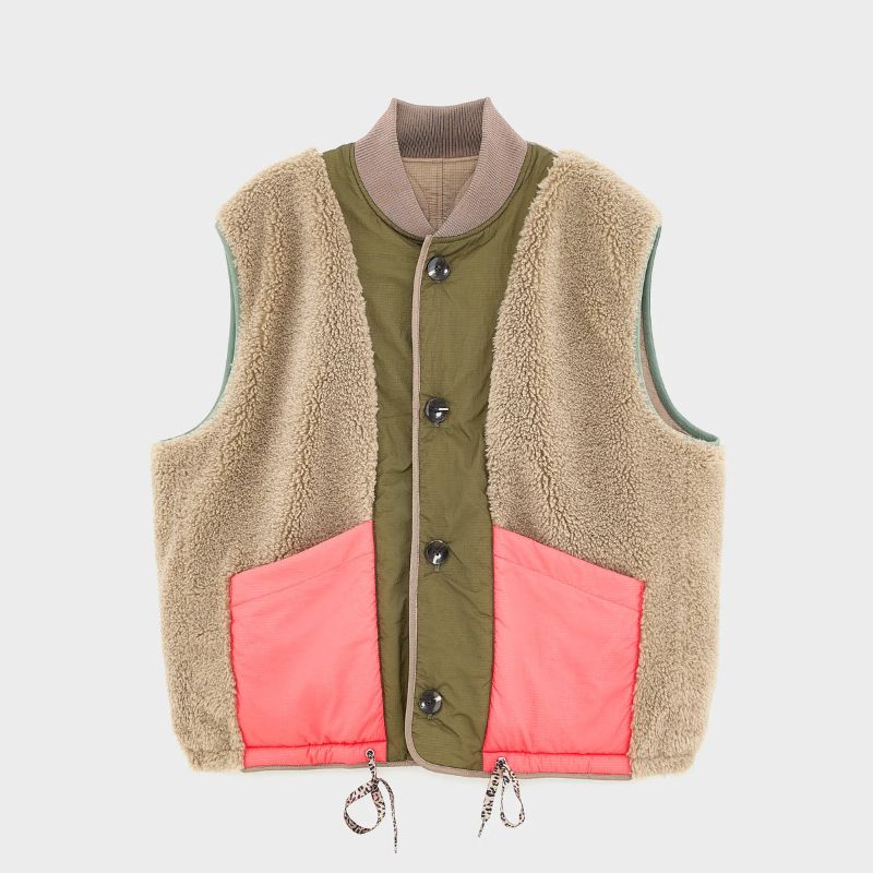 Chaqueta reversible sin mangas con forro polar color topo en un lado con bolsillos con solapa rosa en contraste y tejido acolchado color topo en el otro con bolsillos con solapa color caqui en contraste.