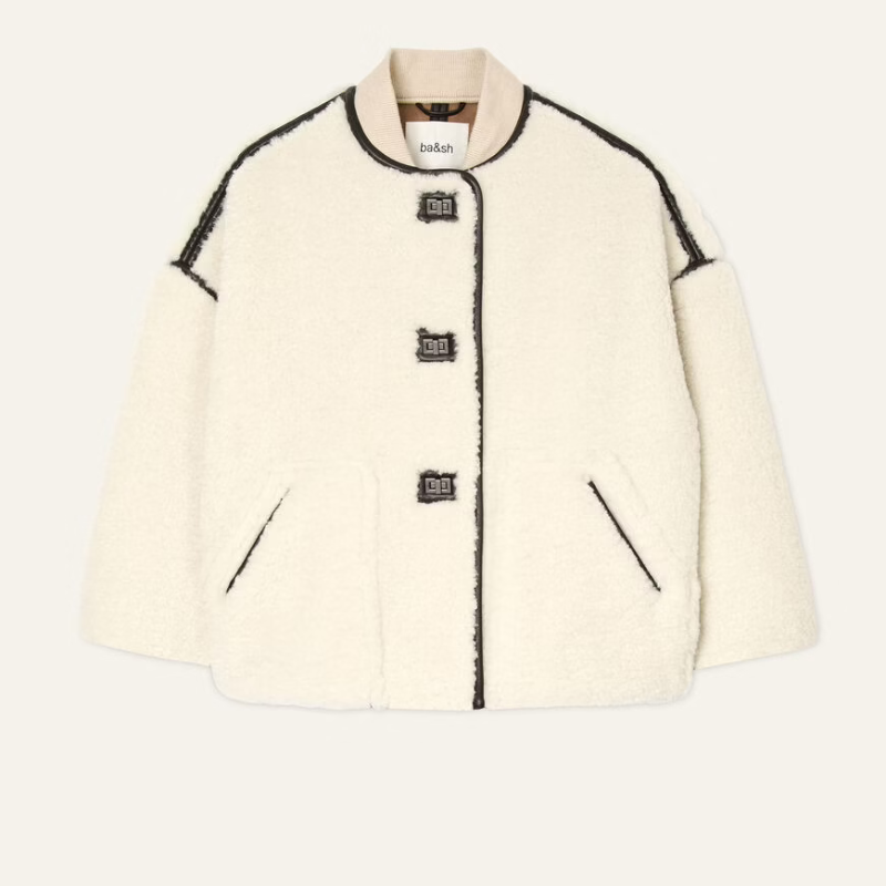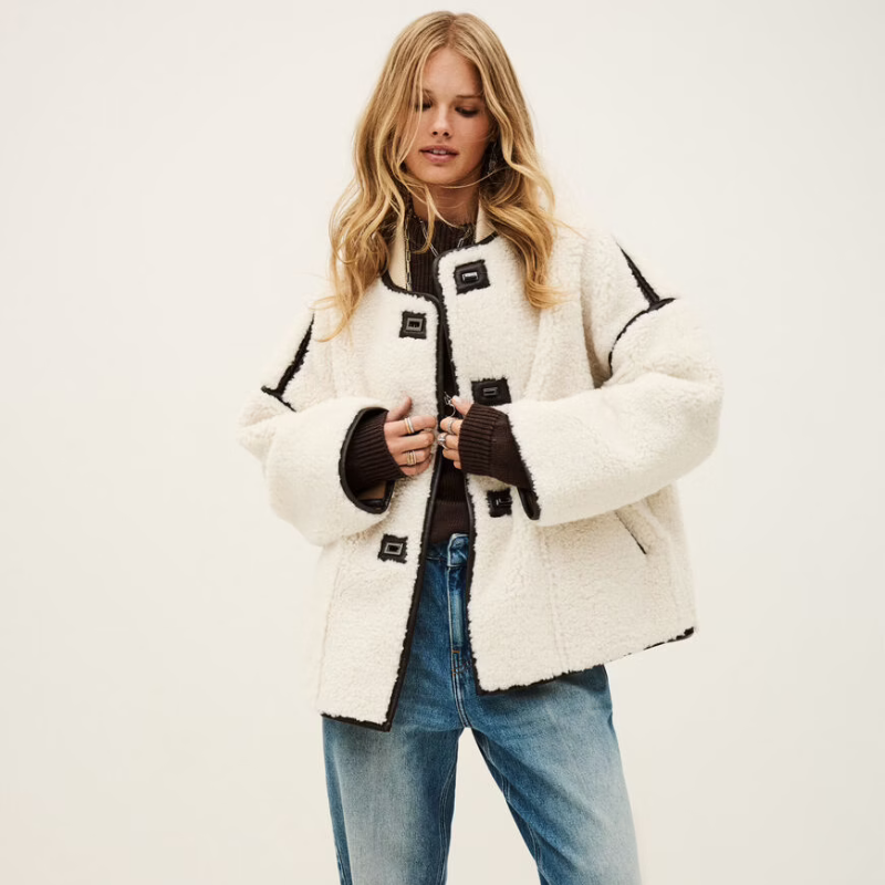Chaqueta oversize de borreguito con detalle de botones a contraste.