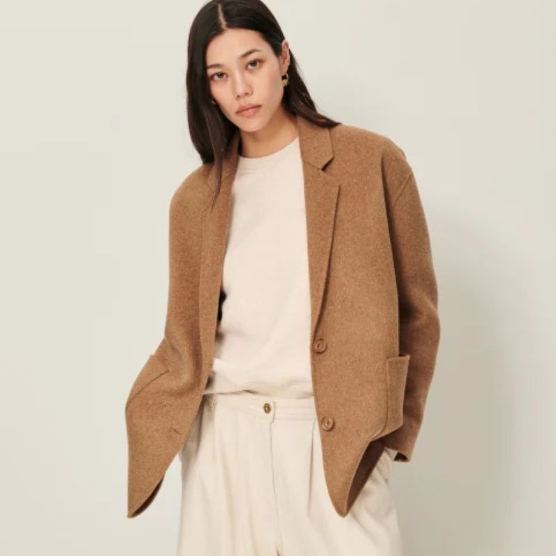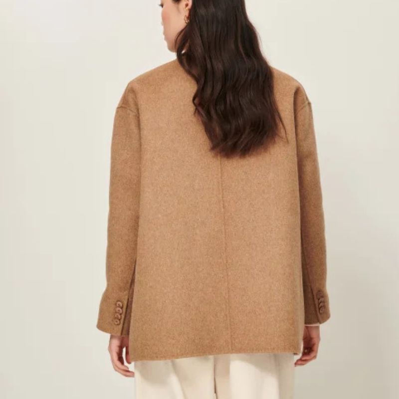 Chaqueta de traje amplia sin forro en lana de tejido doble con acabado aterciopelado.