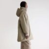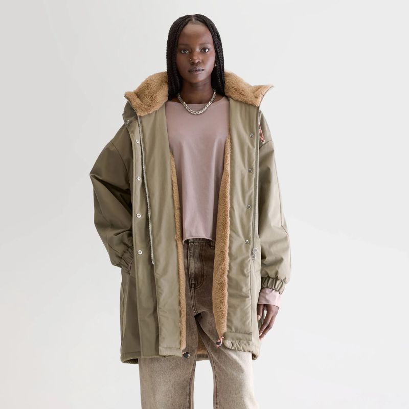 Parka gris polvorienta de gran tamaño con cuello alto y capucha ajustable, cierre de cremallera y botón a presión y forro suave de piel sintética.
