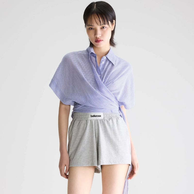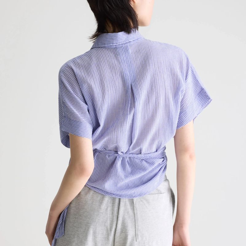 Blusa de cuadros de corte relajado con cierre de lazo en la parte delantera y mangas cortas.