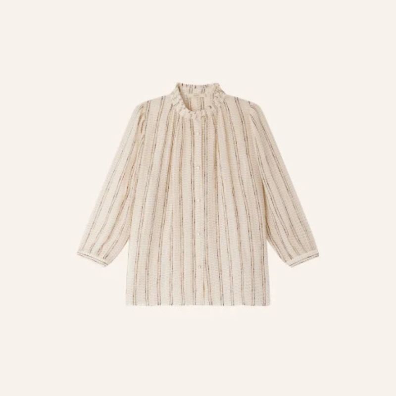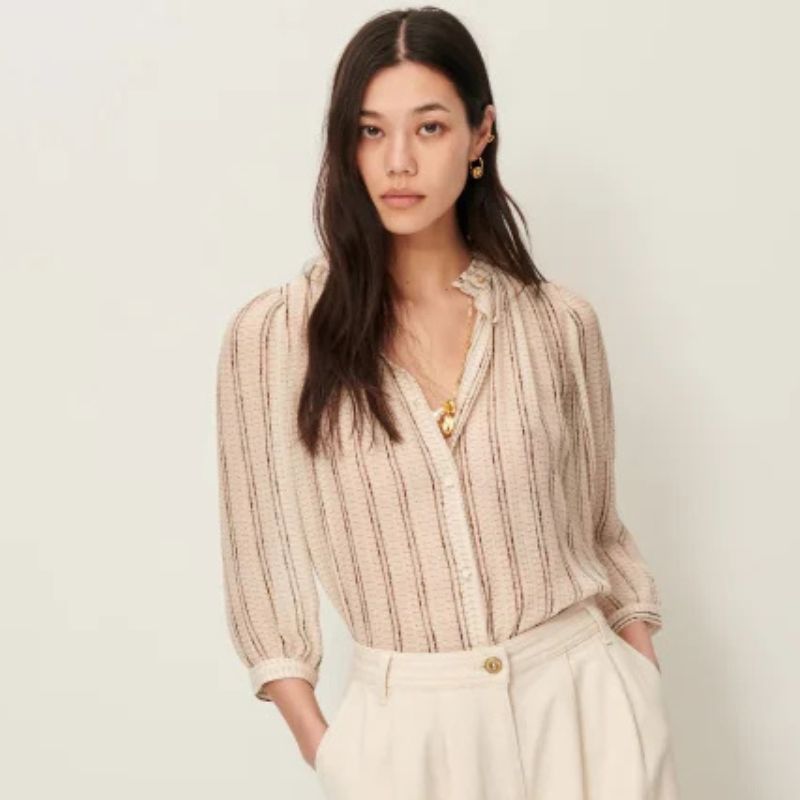 Blusa en crespón de gasa de seda y viscosa estampado con finas rayas metalizadas, motivo exclusivo Sessùn.