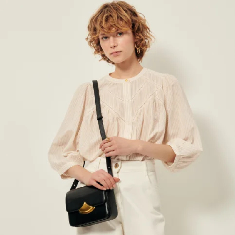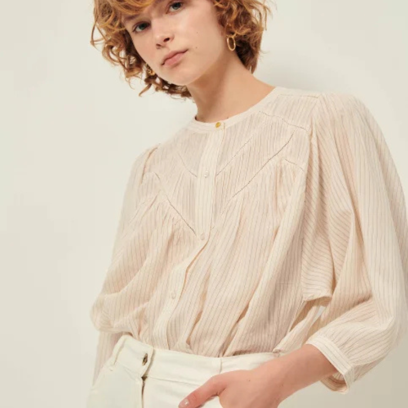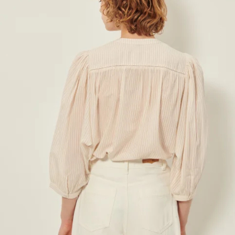 Blusa de manga globo en linón con motivo de rayas finas a contraste.