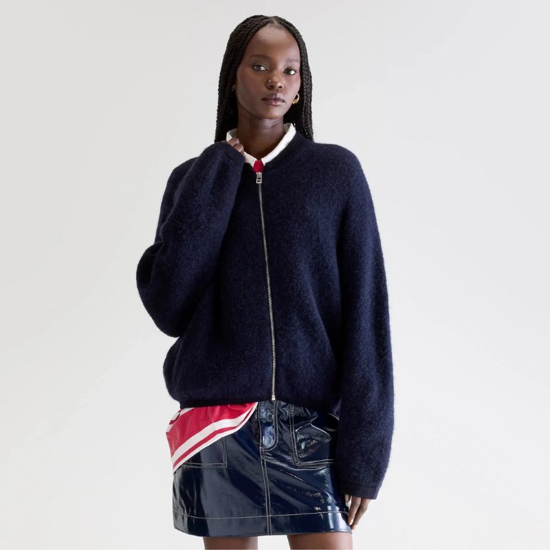 Cárdigan oversize con cremallera frontal, cuello estilo bomber y bordes elásticos, confeccionado en una mezcla azul marino con merino extrafino y alpaca bebé.