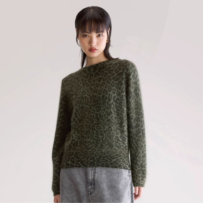 Suéter oversize con estampado de leopardo en una suave mezcla de angora verde.