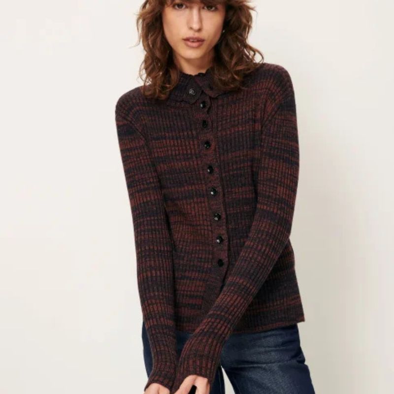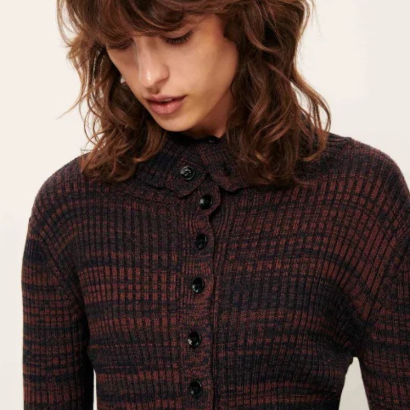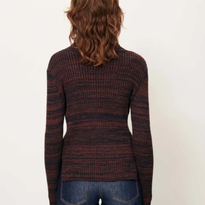 Rebeca en punto acanalado realizado con hilos moteados y degradados.