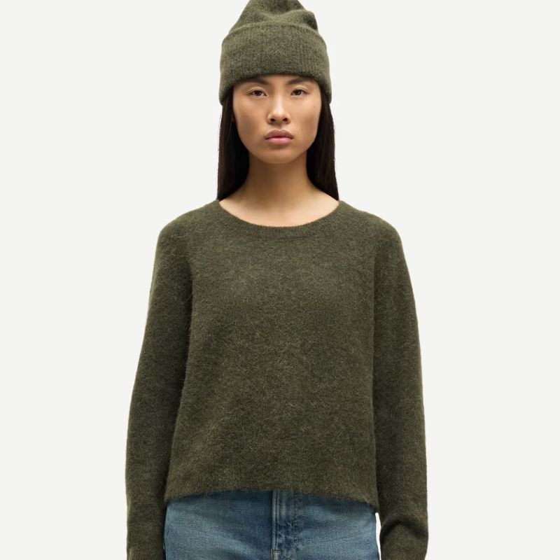 Suéter holgado. Cuello redondo. Tejido principal: mezcla de lana de alpaca y lana de oveja merina.