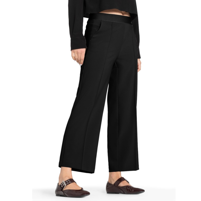 Pantalón tobillero de poliéster con cintura elástica y bolsillos laterales.