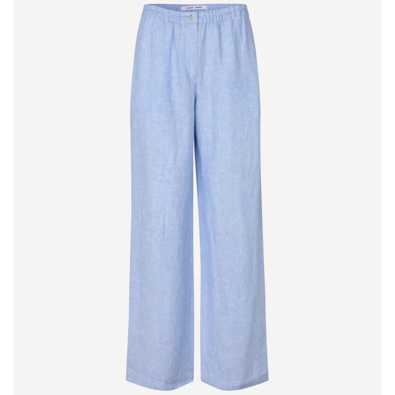 Pantalones de lino de corte regular y pernera ancha. Cierre frontal con botón y cremallera, y cintura elástica. Bolsillos laterales delanteros. Confeccionados en 100% lino.