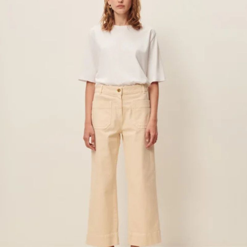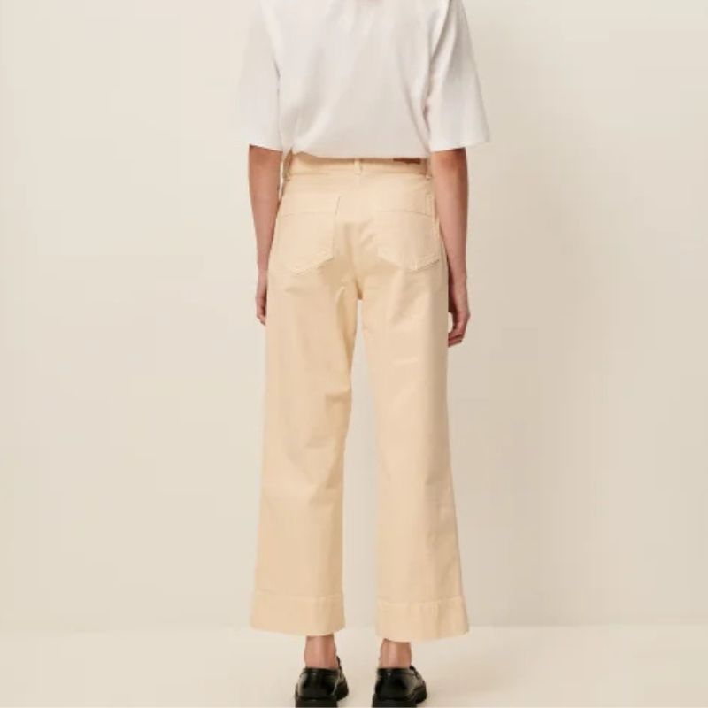 Pantalón vaquero capri acampanado de inspiración marinera en lona de tejido denim teñido por inmersión y deslavado.