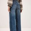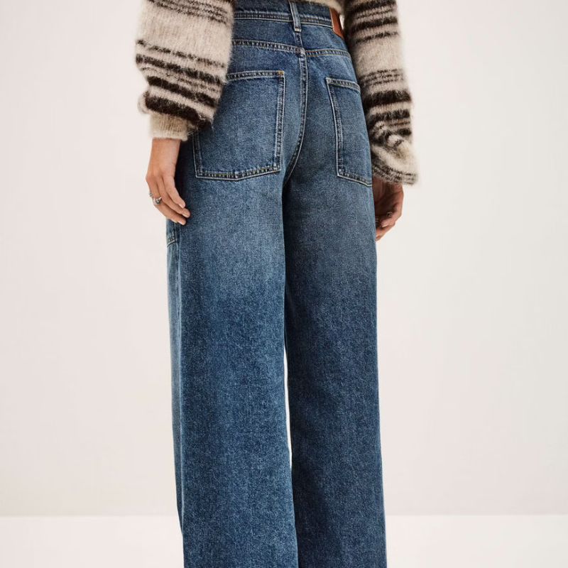 Pantalón de talle medio y pierna ancha. Tiene detalle de bolsillos de parche delanteros.