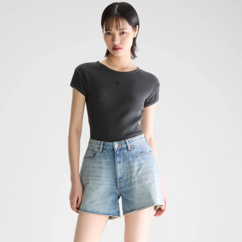 Pantalones cortos vaqueros estilo boyfriend en azul claro vintage con silueta más larga, perneras anchas y bajo sin rematar.