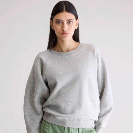 Sudadera relajada con mangas raglán y cuello redondo, confeccionada en tejido polar ligero de color gris chiné.
