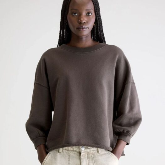 Sudadera de cuello redondo relajado en color chocolate oscuro con dobladillo sin rematar y mangas 3/4.