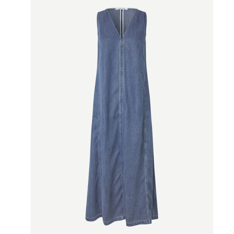 Vestido largo vaquero sin mangas con corte holgado y falda acampanada. Escote en V y espalda recta. Bolsillos laterales. Confeccionado principalmente con 100 % TENCEL™ Lyocell.